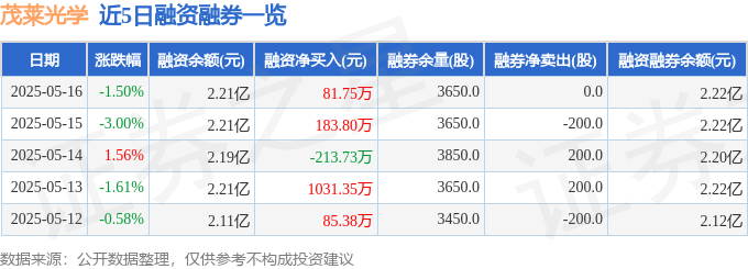 茂莱光学融资融券信息显示,融资方面,当日融资买入2168.53万元,融资偿还2086.77万元,融资净买入81.75万元。融券方面,融券卖出0.0股,融券偿还0.0股,融券余量3650.0股,融券余额98.69万元。融资融券余额2.22亿元。